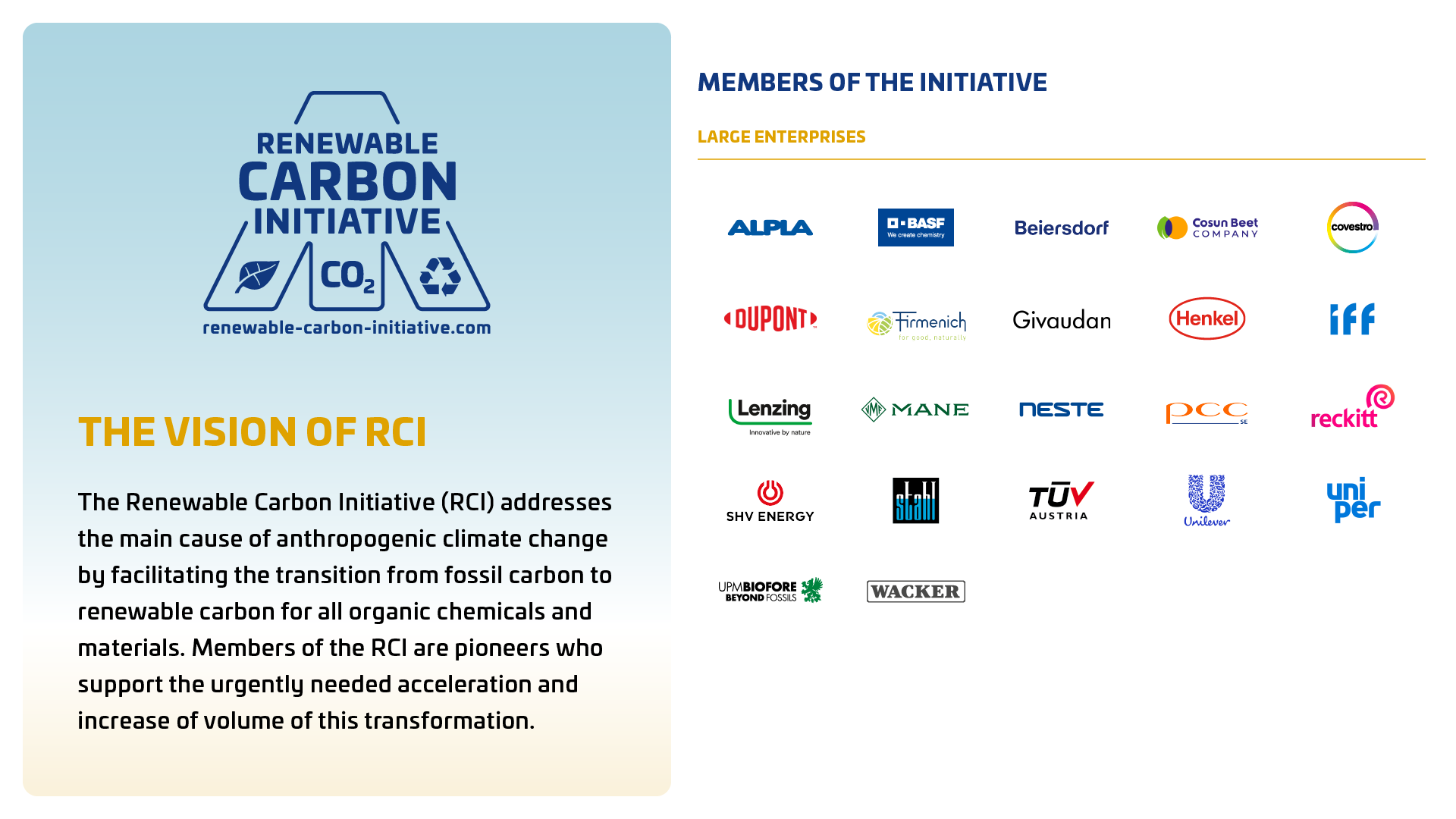 The Renewable Carbon Initiative’s (RCI) major aim is to support the smart transition from fossil to renewable carbon: utilising carbon from biomass, CO2 and recycling instead of additional fossil carbon from the ground. This is crucial because 72% of the human-made greenhouse gas emissions are directly linked to additional fossil carbon. The RCI supports all renewable carbon sources available, but the political support is fragmented and differs between carbon from biomass, recycling or carbon capture and utilisation (CCU). Especially CCU has so far not been a strategic objective in the Green Deal and Fit-for-55.