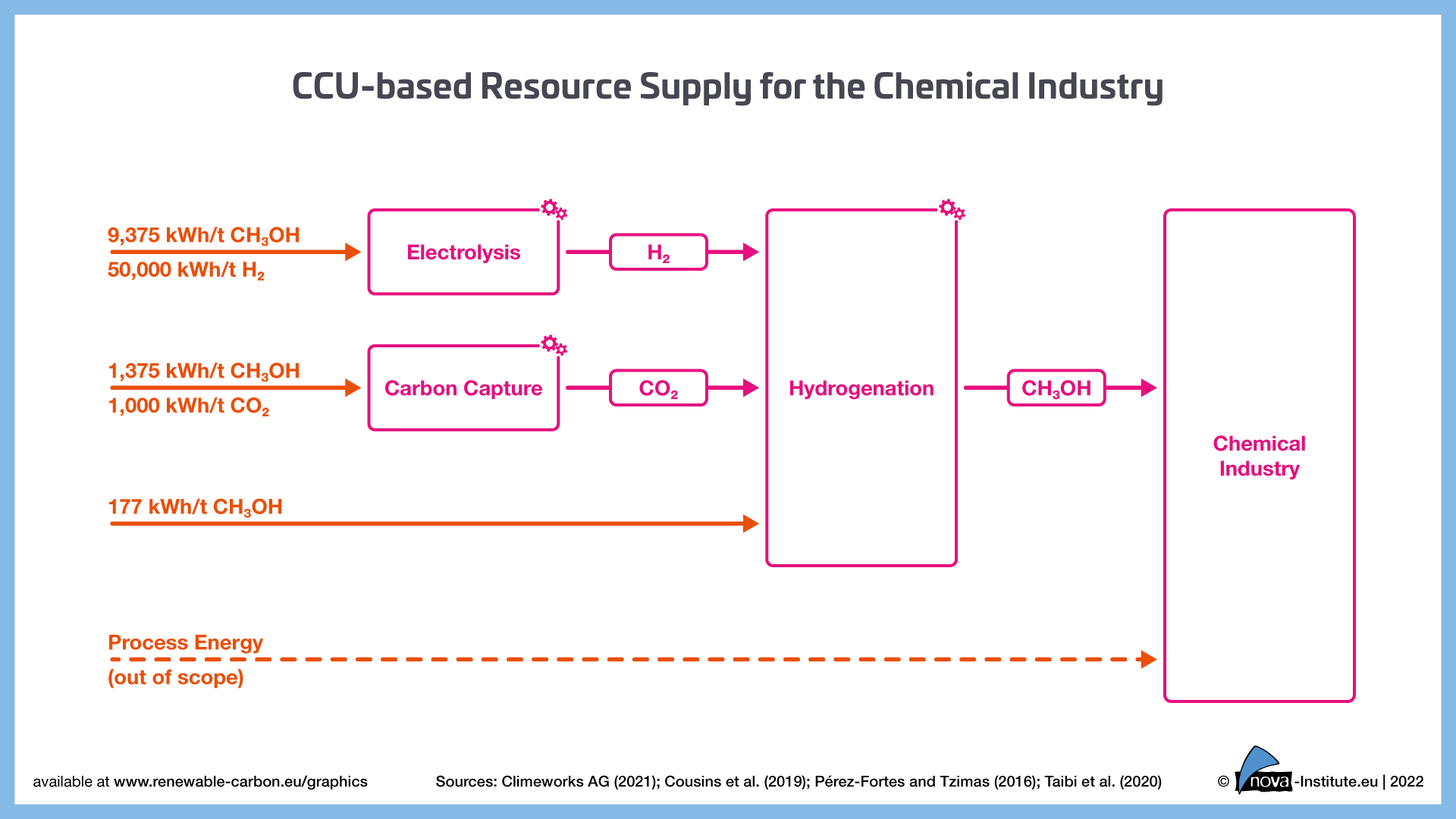 The annual global demand for carbon embedded in chemicals and derived materials could rise from 450 million tonnes of carbon (Mt C) today to 1,000 Mt C by 2050. Meeting this demand with CCU-based methanol would cause an immense demand of 29.1 PWh/year of renewable energy. Enormous efforts would have to be made to deploy sufficient renewable energy. If desert photovoltaic is used to produce the hydrogen, theoretically 1.3% of the Sahara area would be required to cover the entire demand.Â
