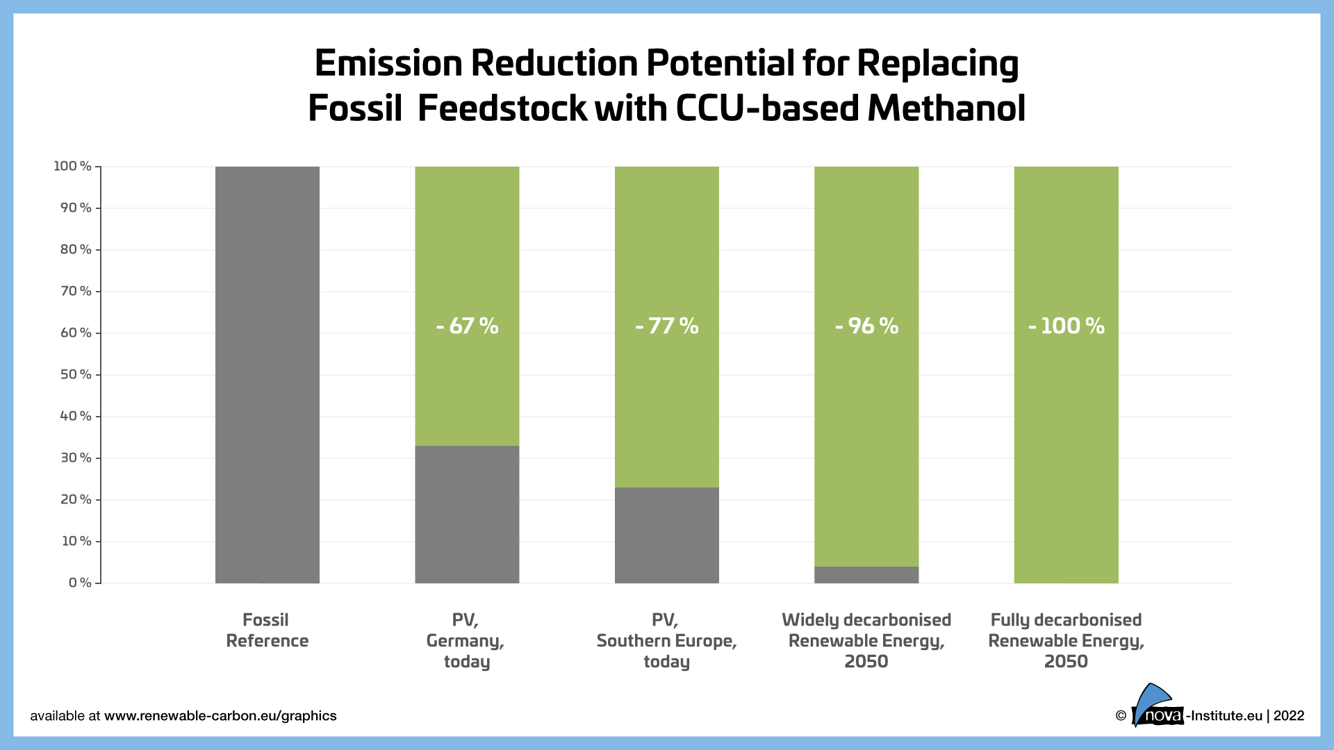 In an exploratory scenario, the study “CO2 reduction potential of the chemical industry through CCU” investigates the greenhouse gas (GHG) reductions that can be achieved in the global chemical and derived material industries if the entire demand for embedded carbon is met solely and exclusively via CO2 instead of from fossil sources. Major simplifications are used to achieve transparency and comprehensibility of the issue. Methanol (CH3OH) is considered to cover the needs for hydrocarbons for chemicals and derived materials among the various chemical intermediates as a representative pathway for renewable carbon. It is a plausible scenario to assign methanol a central role in supplying the chemical industry of the future.