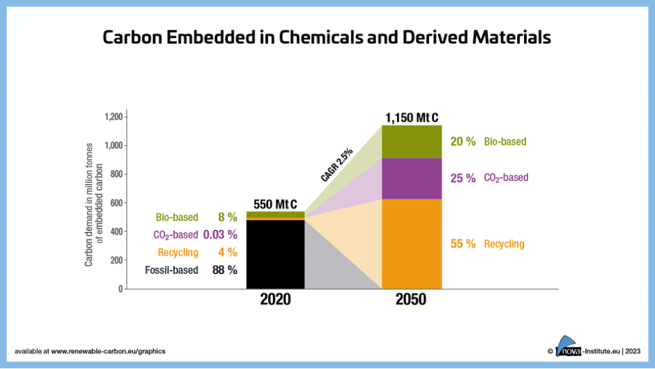 When it comes to carbon, the focus has long been on achieving a zero-carbon, decarbonised energy system wherever possible to avoid CO2 emissions. This is crucial and more urgent than ever to achieve net zero emissions by 2050. However, it is now becoming clear that other large volume sectors such as food and feed, but also all organic chemistry, plastics and significant parts of the materials sector are fundamentally and increasingly dependent on carbon. In the chemicals and plastics sectors in particular, almost 90% of the carbon used as feedstock is fossil carbon. This fossil carbon must be replaced by renewable carbon from recycling, biomass and CO2 by 2050 to avoid a further influx of fossil carbon into our technosphere and atmosphere.