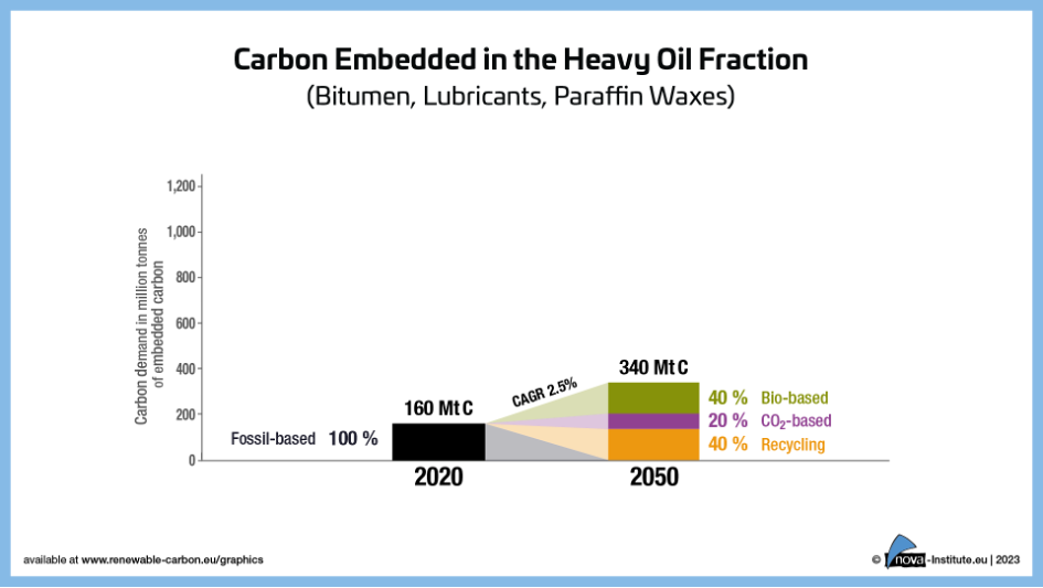 Zooming in on the chemical industry, it still strongly depends on fossil carbon as raw material feedstock with more than 90% fossil carbon share, both globally and in the EU. When compared to other statistics, this figure is surprisingly high, but in the RCI’s report the heavy oil fraction (mainly bitumen) is included for the first time – an application sector exclusively consuming fossil carbon so far.