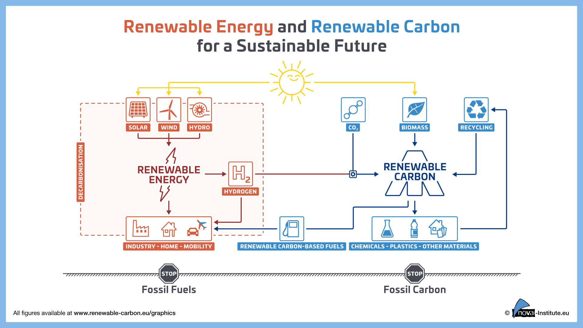 The focus of climate policy has been, and to a large extent still is, the decarbonisation of the energy sector, where significant progress has been made in the use of alternative energy sources such as solar, wind, hydro, geothermal and green hydrogen as an energy carrier. Decarbonisation is the right term here because all these options do not rely on carbon-based fossil fuels. In contrast, the products of industrial sectors such as chemicals, derived materials, plastics and construction products are predominantly carbon-based and cannot be decarbonised by their very nature. Even in the energy sector, some applications such as aviation or shipping will not be electrified in the foreseeable future and require carbon-based fuels.