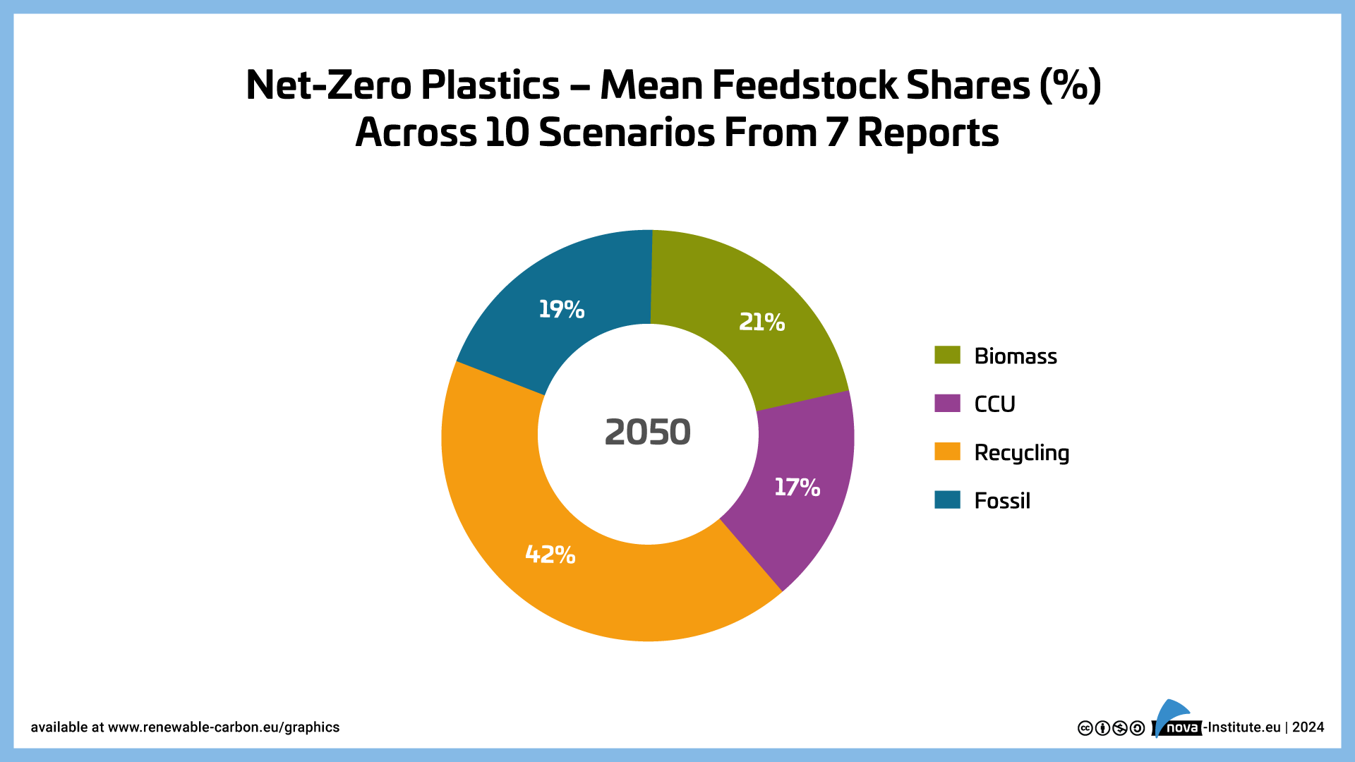 For the plastics sector, 10 scenarios across 7 reports project shares of: 21% biomass, 17% CCU, 42% recycling and 19% fossil & CCS (see Fig. 2). Not surprisingly, the recycling rate for plastics is more than twice that of the chemicals sector as a whole. Plastics are easier to recycle and keep in circulation than other chemical products.